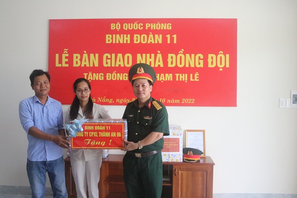 Sáng ngày 28-10, tại thành phố Đà Nẵng, thừa ủy quyền của Tư lệnh Binh đoàn 11, Công ty CPXL Thành An 96 tổ chức Lễ bàn giao Nhà đồng đội tặng gia đình đồng chí Phạm Thị Lê - Nhân viên Tài chính thuộc Xí nghiệp Xây lắp 33, Công ty CPXL Thành An 96, Binh đoàn 11.