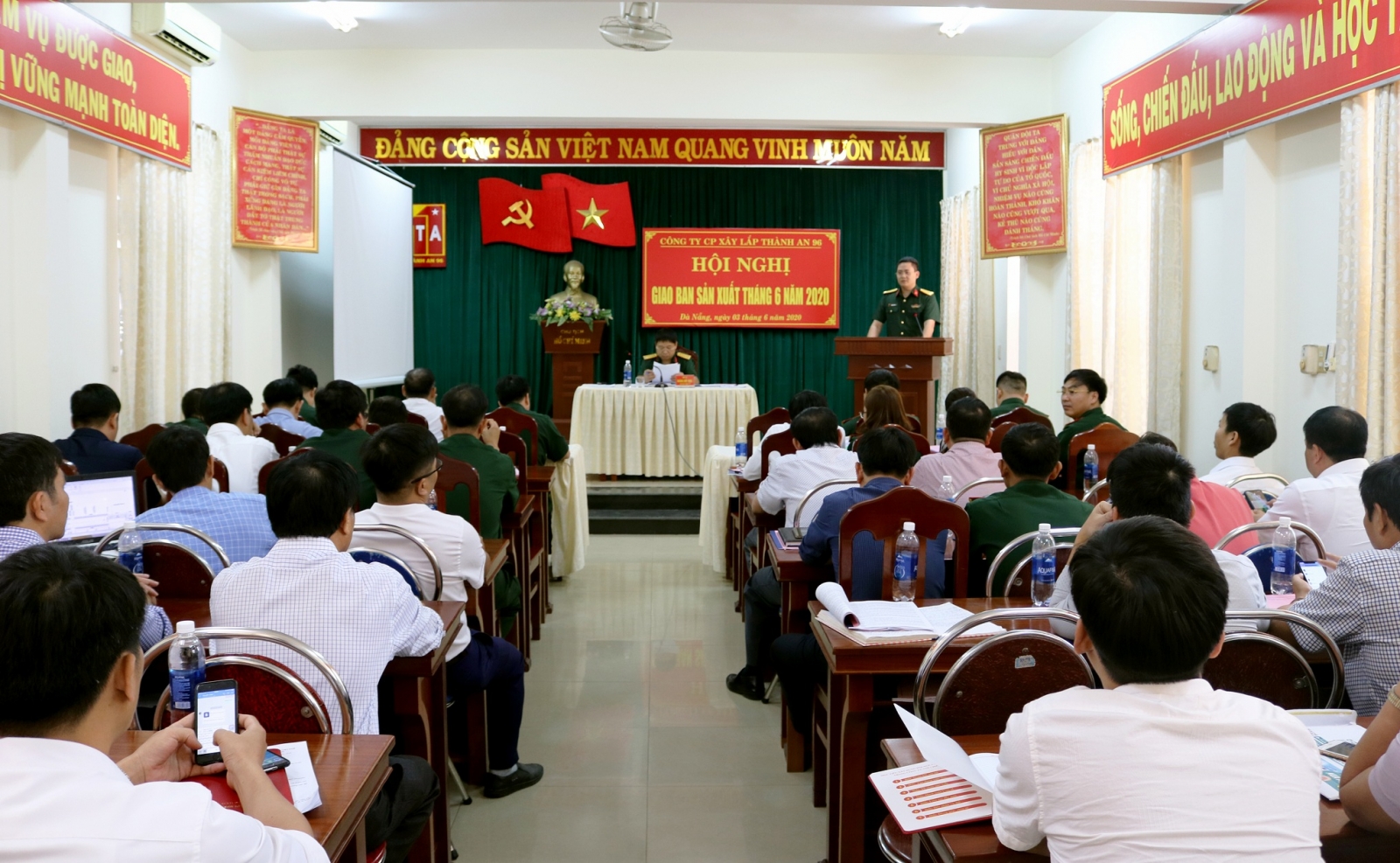 Kế tiếp trao Quyết định thăng quân hàm sĩ quan, Công ty tổ chức Hội nghị Giao ban sản xuất tháng 6 năm 2020. Đồng chí Đại tá Hoàng Đức Trúc - Giám đốc Công ty chủ trì Hội nghị.