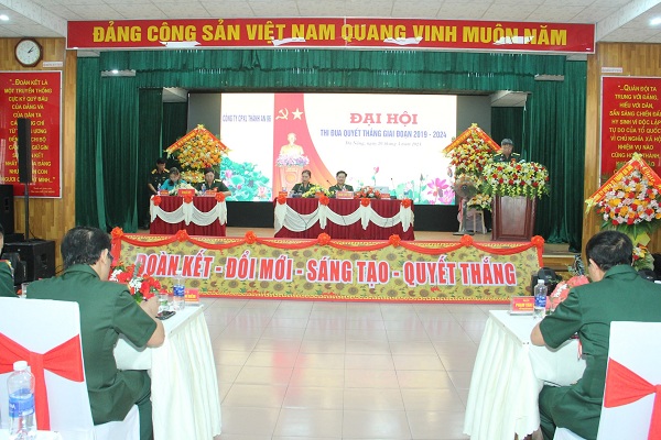 Đồng chí Đại tá Hoàng Đức Trúc, ĐUV Binh đoàn, Giám đốc, Chủ tịch HĐTĐ-KT Công ty phát biểu khai mạc Đại hội trong không khí phấn khởi, vui tươi của cán bộ, CNV và người lao động toàn Công ty. Thay mặt đoàn chủ tịch đồng chí Đại tá Phan Xuân Bằng, Bí thư Đảng ủy, Chủ tịch HĐQT Công ty trình bày báo cáo trung tâm kết quả công tác TĐ-KT và Phong trào TĐQT giai đoạn 2019-2024. Trong báo cáo nêu rõ 5 năm qua, dưới sự lãnh đạo, chỉ đạo trực tiếp của Đảng ủy Binh đoàn, hướng dẫn của Phòng Chính trị, công tác TĐ-KT và Phong trào TĐQT trong Công ty được triển khai toàn diện, đồng bộ, có nhiều đổi mới, sáng tạo, gắn kết chặt chẽ với phong trào thi đua yêu nước, các phong trào thi đua, cuộc vận động của Trung ương, địa phương và đơn vị đạt kết quả rất thiết thực. Phong trào TĐQT đã hướng về cơ sở, bám sát nhiệm vụ chính trị, nhiệm vụ trọng tâm, đột kích đẩy mạnh kết quả sản xuất kinh doanh với hàng trăm chương trình thi đua kích thích sản xuất kinh doanh, với nội dung, chỉ tiêu thi đua tập trung vào nâng cao hiệu quả sản xuất kinh doanh, tăng doanh thu, ổn định đời sống cho người lao động, bằng các hình thức phong phú, sinh động. Thông qua các phong trào thi đua, cuộc vận động, đã cổ vũ, động viên khích lệ cán bộ, CNV và NLĐ luôn đoàn kết, sáng tạo, phấn đấu vươn lên lập nhiều thành tích, góp phần quan trọng để Công ty hoàn thành thắng lợi mọi nhiệm vụ được giao.