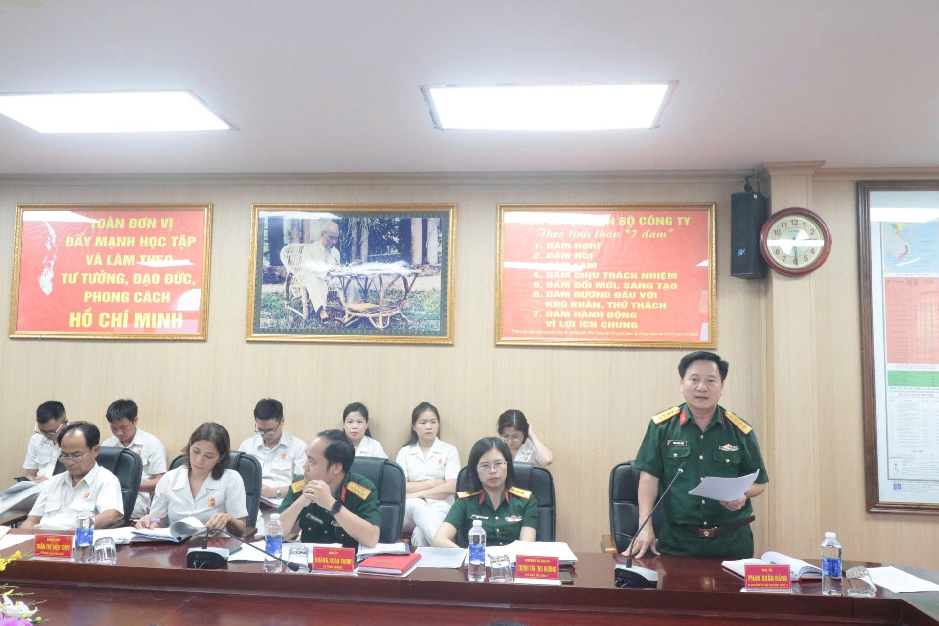 Đồng chí Đại tá Phan Xuân Bằng- Bí thư Đảng uỷ, Chủ tịch HĐQT Công ty, đánh giá cao kết quả triển khai các mặt hoạt động CTĐ,CTCT tháng 8 trong toàn Công ty và định hướng một số nội dung CTĐ,CTCT trong toàn đảng bộ tháng 9 và thời gian tiếp theo, tập trung làm tốt công tác tư tưởng người lao động, tổ chức hoạt động thi đua cao điểm có hiệu quả để khắc phục khâu yếu, mặt yếu. Tổ chức tốt kế hoạch giáo dục chính trị cơ bản, giáo dục lý luận cho quần chúng đối tượng đảng, đảng viên mới, tổ chức thi tìm hiểu các nghị quyết của Đảng trên Internet lần thứ nhất do Ban tuyên giáo, dân vận Trung ương phát động. Tổ chức chặt chẽ đẩy mạnh tinh thần học tập chuyển đổi số, bình dân học vụ số trong toàn đơn vị.