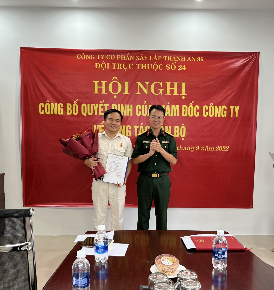 Căn cứ vào Quyết nghị của Ban Thường vụ Đảng uỷ, HĐQT và của Giám đốc Công ty; ngày 05/9/2022, Công ty cổ phần xây lắp Thành An 96 tổ chức Hội nghị công bố các quyết định về công tác cán bộ tháng 9 năm 2022. Tới dự hội nghị có các đồng chí trong BTV Đảng uỷ, HĐQT, Ban Giám đốc Công ty, chỉ huy các phòng chức năng Công ty; Cấp uỷ, chỉ huy các đơn vị và các đồng chí cán bộ được bổ nhiệm.