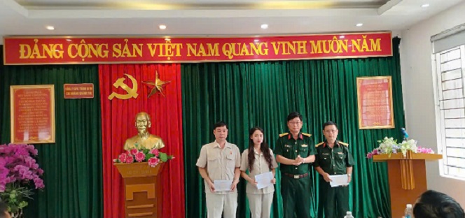 Trung tá Nguyễn Văn Kháng – Phó Giám đốc Công ty, kiêm Giám đốc CN Quảng Trị đã trao quà của Bộ Quốc phòng, quà của Công ty cho CB, CNV thuộc đối tượng chính sách đang công tác tại CN Quảng Trị