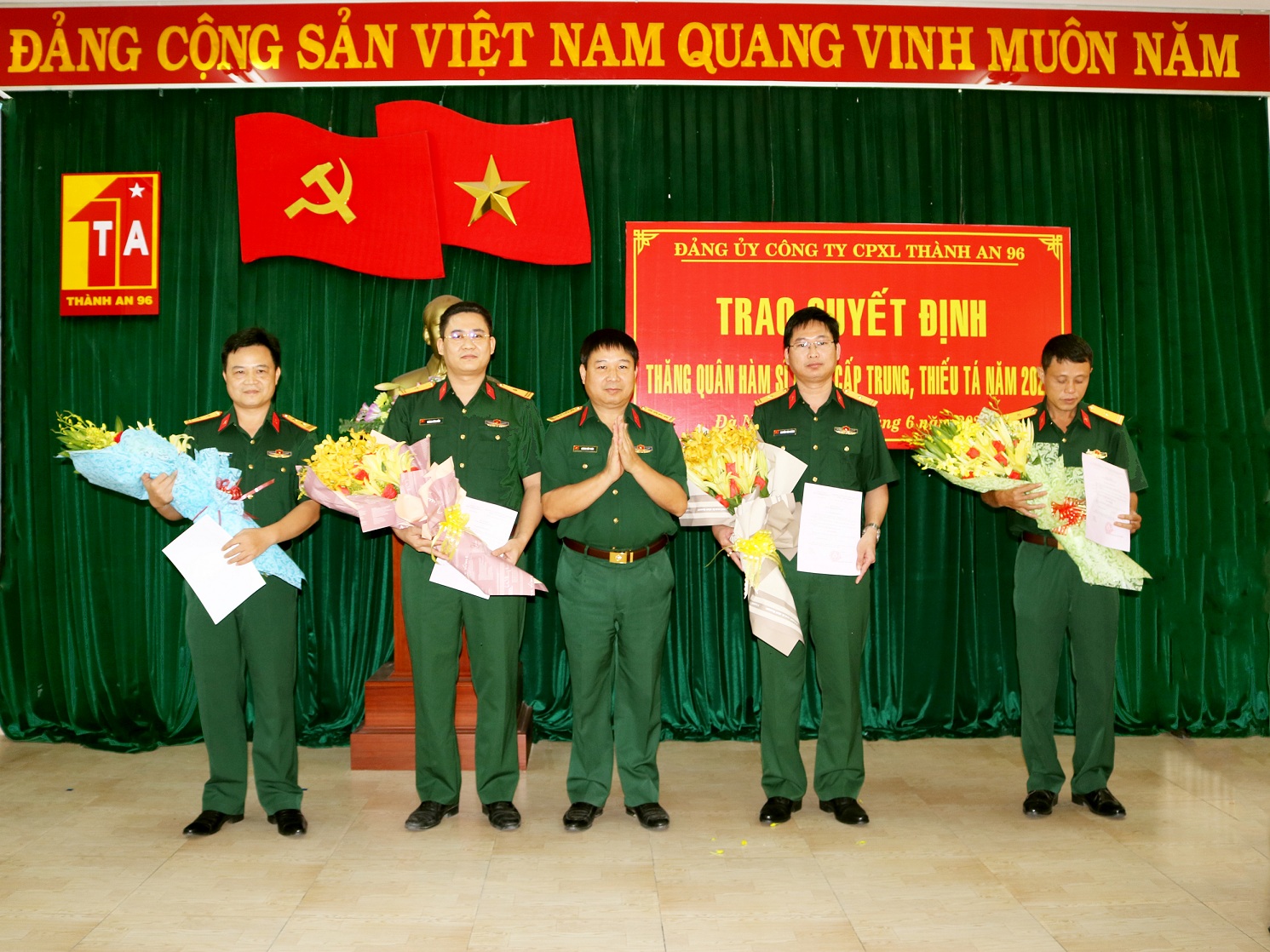 Sáng ngày 03/6/2020, tại Trụ sở Công ty CPXL Thành An 96, Số 02 Nguyễn Văn Trỗi, P.Hoà Thuận Đông, Q.Hải Châu, Tp.Đà Nẵng. Thường vụ Đảng ủy Công ty đã tổ chức công bố Quyết định thăng quân hàm sĩ quan cấp Trung, Thiếu tá năm 2020 cho các đồng chí đến niên hạn theo quyết định của Bộ trưởng Bộ Quốc phòng và Tư lệnh Binh đoàn 11.