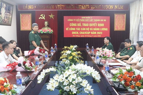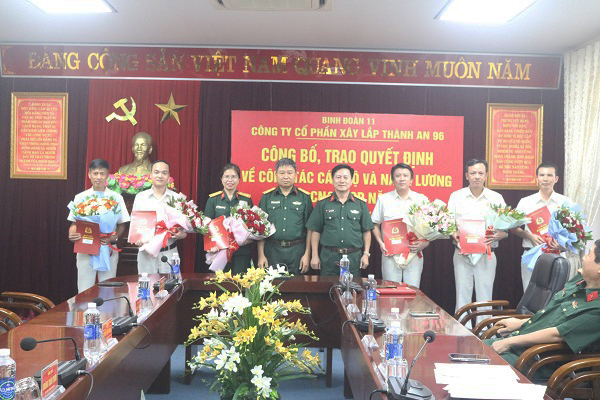 Chiều ngày 19/7/2023 tại văn phòng trụ sở, Công ty CPXL Thành An 96 đã tổ chức Hội nghị công bố và trao các quyết định cán bộ, nâng lương QNCN, CN&VCQP năm 2023. Tham dự Hội nghị có các đồng chí trong Ban Thường vụ Đảng ủy, HĐQT, Ban Giám đốc và cán bộ chủ trì các cơ quan Công ty, các đại diện tổ chức quần chúng.