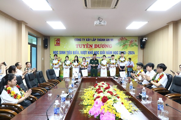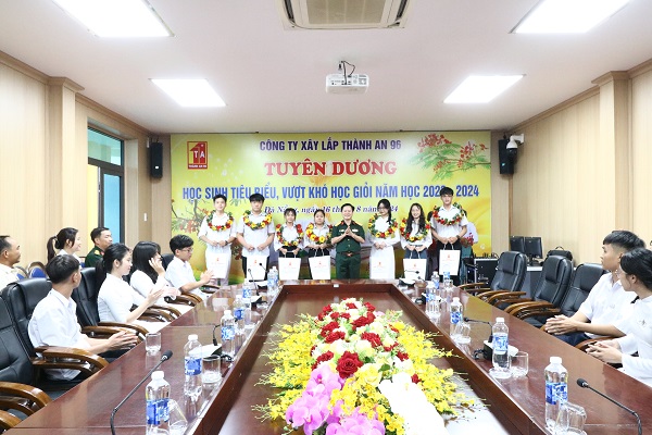 Năm học 2023-2024, toàn Công ty có 392 cháu đạt học sinh giỏi, tiêu biểu xuất sắc. Trong đó, có 15 cháu học sinh giỏi 12 năm liên tục, đoạt giải tại các kỳ thi cấp quốc gia, tỉnh, thành phố và 01 cháu học sinh nghèo vượt khó học giỏi. Đây là niềm vinh dự, tự hào, hạnh phúc của các em học sinh, của gia đình, nhà trường, các thầy cô giáo và của gia đình cán bộ, công nhân viên, người lao động trong Công ty Thành An 96.
