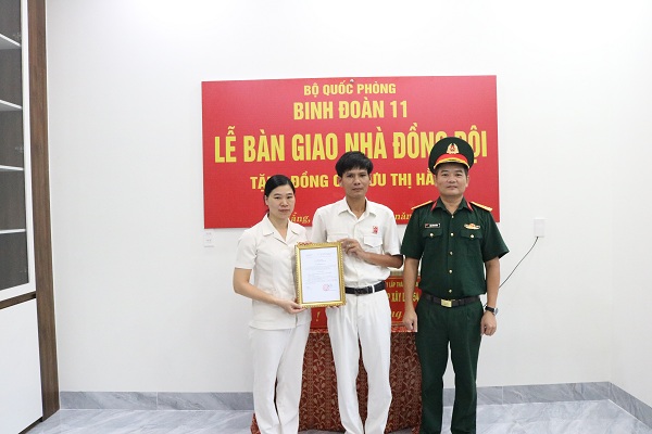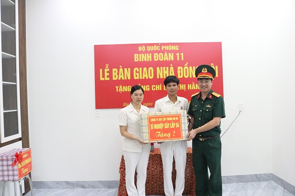 Phát biểu tại lễ bàn giao đồng chí Trung tá Đặng Đình Khiêm - Phó Giám đốc Công ty, chia sẻ: Đây là món quà có ý nghĩa sâu sắc thể hiện sự quan tâm của Quân uỷ Trung ương, Bộ Quốc phòng, Binh đoàn 11 và lãnh đạo, chỉ huy các cấp đối với cán bộ, nhân viên, người lao động có hoàn cảnh khó khăn trong đơn vị. Công trình “Nhà đồng đội” thể hiện tinh thần tương thân, tương ái, cùng chung tay giúp đỡ đồng chí, đồng đội; lan tỏa sự yêu thương, đùm bọc lẫn nhau nhằm giúp gia đình các đồng chí sớm ổn định cuộc sống để an tâm công tác. Từ đó tiếp tục cống hiến và thực hiện tốt chức trách, nhiệm vụ được giao.