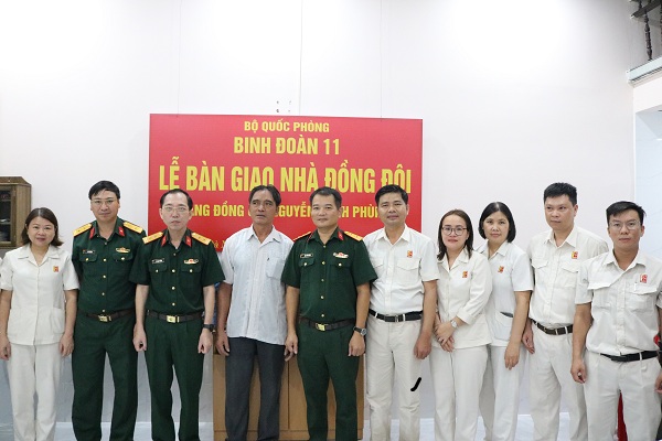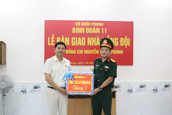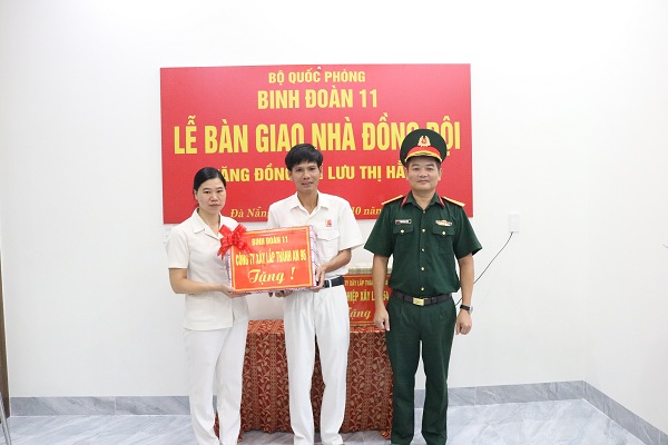 Sáng ngày 14-10, tại thành phố Đà Nẵng, thừa ủy quyền của Tư lệnh Binh đoàn 11, Công ty Xây lắp Thành An 96 tổ chức Lễ bàn giao Nhà đồng đội tặng gia đình 02 cán bộ, công nhân viên, người lao động thuộc Xí nghiệp xây lắp 54, Công ty Xây lắp Thành An 96, là đồng chí Lưu Thị Hằng- Nhân viên Tài chính và đồng chí Nguyễn Cảnh Phùng - Nhân viên Lái xe.