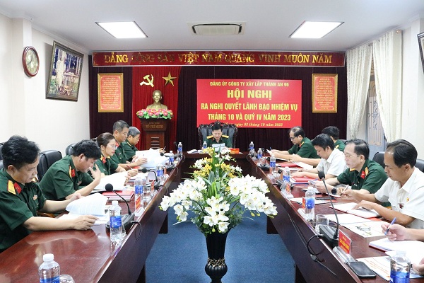 Sáng ngày 03/10/2023, tại trụ sở Công ty xây lắp Thành An 96, Đảng ủy Công ty đã tổ chức Hội nghị Đảng ủy ra Nghị quyết lãnh đạo nhiệm vụ tháng 10 và quý IV năm 2023; dự và chỉ đạo hội nghị có đồng chí Đại tá Vũ Văn Điềm - Bí thư Đảng uỷ, Phó Tư lệnh Binh đoàn 11, cùng các đồng chí trong Đảng ủy, ban Giám đốc Công ty.