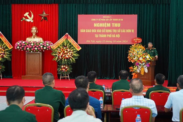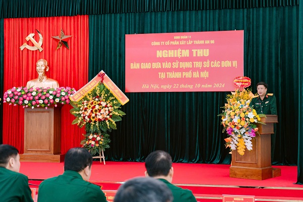 Phát biểu nghiệm thu đưa vào sử dụng trụ sở các đơn vị tại thành phố Hà Nội, đồng chí Đại tá Hoàng Đức Trúc - Giám đốc Công ty cho biết, công trình được nghiệm thu đưa vào sử dụng lần này với diện tích xây dựng 700m2; quy mô xây dựng mới 01 khối nhà 04 tầng và 01 tum, cấp III, có tổng diện tích sàn 3.218m2. Tổng vốn đầu tư hơn: 27,5 tỷ đồng, với tổng thời gian thi công, hoàn thành gần 04 tháng (thời gian khởi công, hoàn thành từ ngày 23/5/2024 đến ngày 31/8/2024).