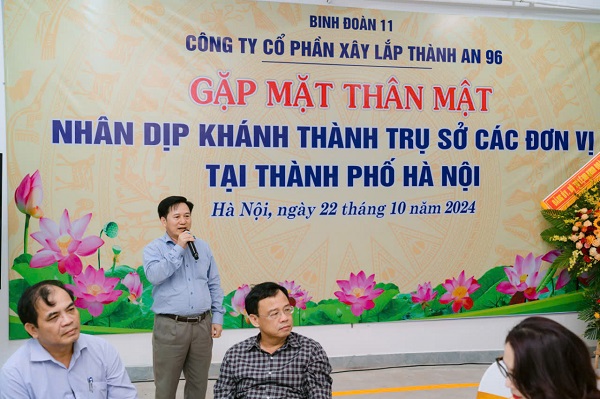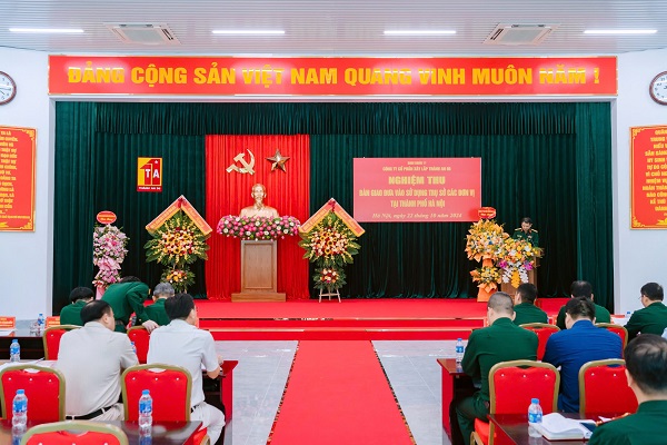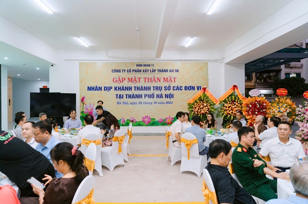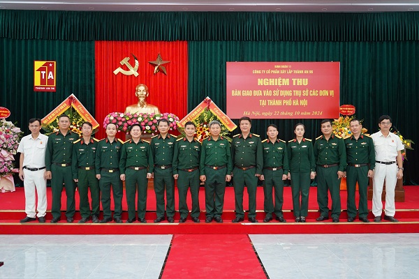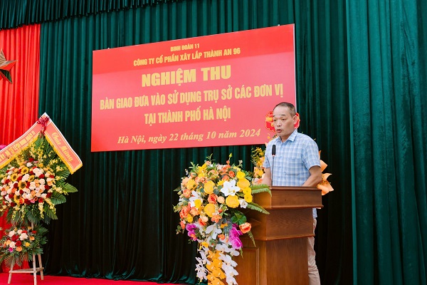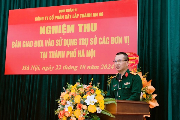Ngày 22/10/2024 tại thành phố Hà Nội, Công ty xây lắp Thành An 96, Binh đoàn 11 đã tổ chức nghiệm thu bàn giao đưa vào sử dụng trụ sở các đơn vị tại thành phố Hà Nội. Chủ trì nghiệm thu bàn giao đồng chí Đại tá Hoàng Đức Trúc, ĐUV Binh đoàn, Phó Bí thư Đảng ủy, Giám đốc Công ty. Tham dự nghiệm thu có các đồng chí trong cơ quan chuyên môn Binh đoàn; các đồng chí trong Ban Quản lý dự án Công ty và các nhà thầu tư vấn thiết kế, tư vấn giám sát, đơn vị thi công.