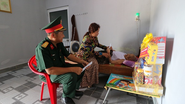 Cũng trong dịp này, Chỉ huy Công ty đã tổ chức thăm hỏi và trao quà của Chủ tịch nước, quà của Bộ Quốc phòng, quà của Binh đoàn 11 và quà của Công ty cho gia đình các đối tượng chính sách, gia đình các đồng chí là con Liệt sĩ, Thương binh, Bệnh binh đang công tác tại đơn vị. Tại mỗi gia đình đến thăm, các đồng chí lãnh đạo Chỉ huy và các thành viên trong đoàn đã trân trọng trao quà, dành thời gian thăm hỏi tình hình sức khỏe, bày tỏ lòng biết ơn sâu sắc đối với những cống hiến, hy sinh xương máu của các Liệt sĩ, thương, bệnh binh, những người có công trong sự nghiệp đấu tranh giải phóng dân tộc, thống nhất đất nước. Đồng thời, mong muốn các đồng chí là con em gia đình Liệt sĩ, thương, bệnh binh luôn giữ vững và phát huy phẩm chất Bộ đội Cụ Hồ, truyền thống yêu nước, gương mẫu đi đầu trong thực hiện chủ trương, chính sách, pháp luật của Đảng, Nhà nước.