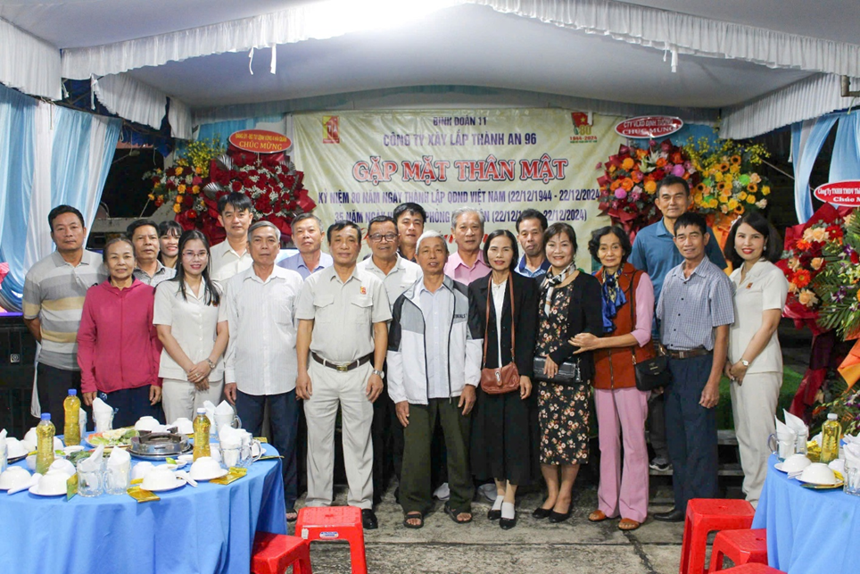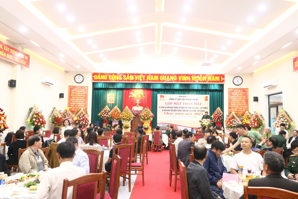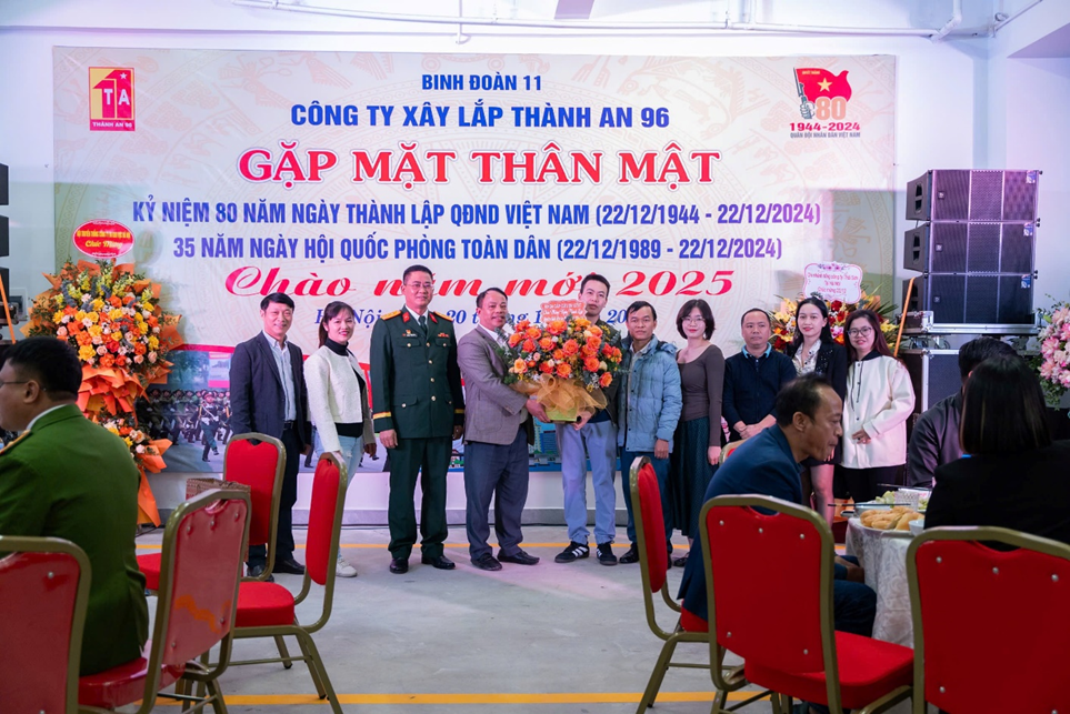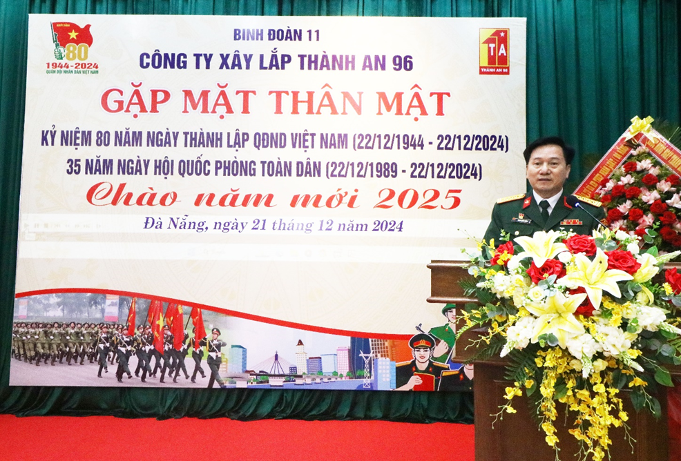 Toàn cảnh buổi gặp mặt tại Đà Nẵng Phát biểu tại buổi gặp mặt, đồng chí Đại tá Phan Xuân Bằng - Bí thư Đảng ủy, Chủ tịch HĐQT Công ty nêu những nét khái quát truyền thống hào hùng của Quân đội, khẳng định trách nhiệm của thế hệ trẻ, lớp người đi sau luôn kính trọng, tôi vinh sự cống hiến hy sinh đổ mồ hôi, xương máu của các cha anh đi trước để tạo dựng hòa bình, đem lại sự bình yên cho cuộc sống hôm nay. Cán bộ, nhân viên Công ty CPXL Thành An 96 tiếp tục vun đắp tô thắm truyền thống Quân đội và đơn vị . Cùng với báo cáo thành tích đạt được trong năm 2024, phương hướng ổn định, phát triển Công ty trong năm 2025, đồng chí Bí thư Đảng ủy, Chủ tịch HĐQT cảm ơn sự nhiệt tình giúp đỡ, đồng hành của Thủ trưởng, các doanh nghiệp, chính quyền địa phương và các cơ quan, đoàn thể để Công ty CPXL Thành An 96 có thuận lợi phát triển, tăng trưởng; Hướng tới chào mừng Đại hội Đảng các cấp, Công ty sẽ tiếp tục giữ vững sự đoàn kết, sáng tạo, đổi mới lập thành tích cao nhất, hoàn thành xuất sắc mọi nhiệm vụ được giao.