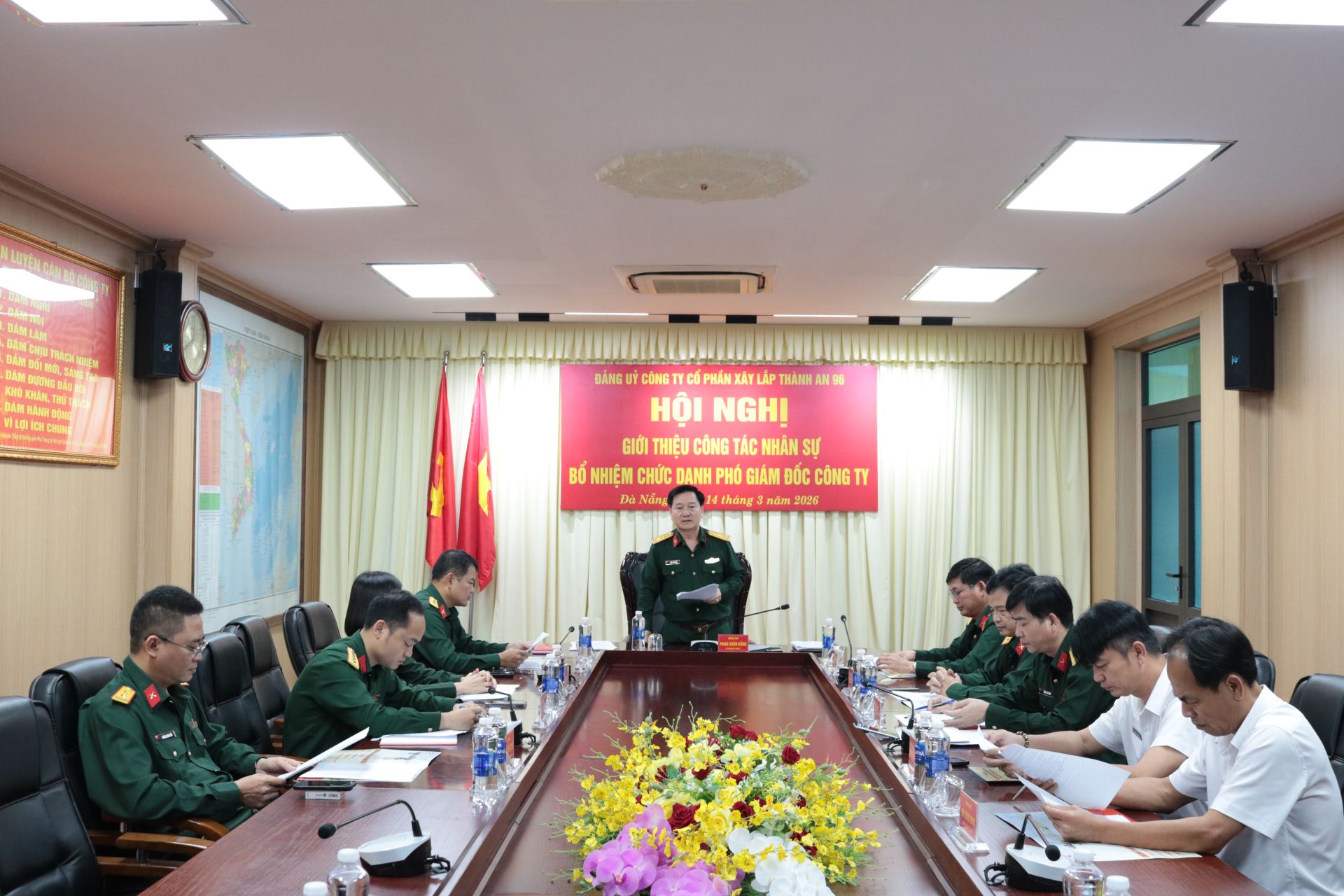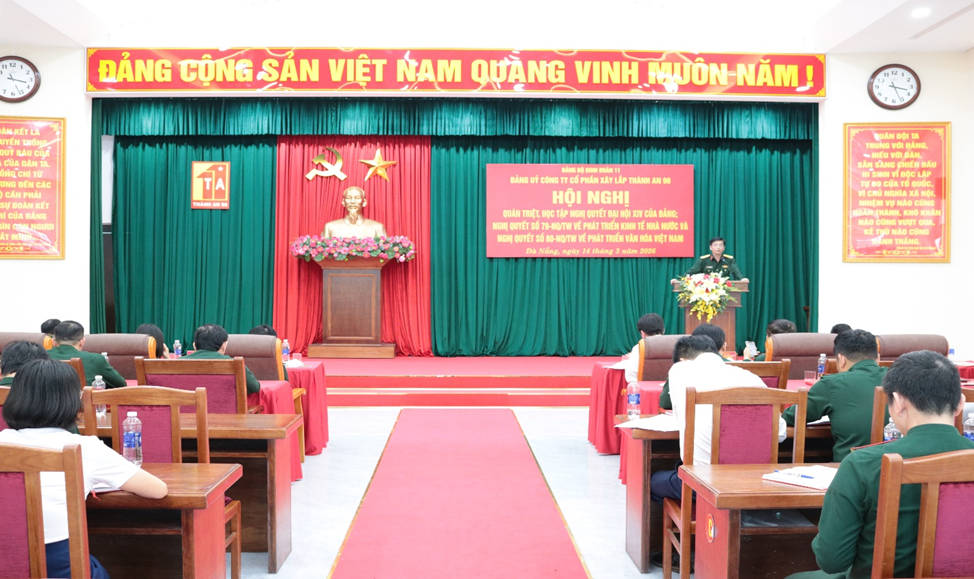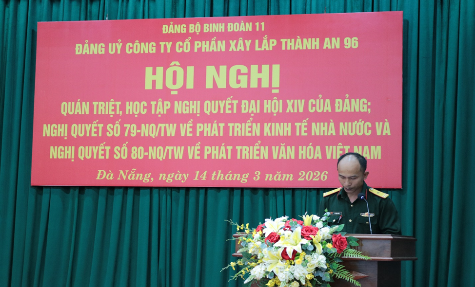Ngày 14/3/2026, tại TP.Đà Nẵng, Đảng ủy Công ty CPXL Thành An 96, tổ chức Hội nghị công tác cán bộ và Hội nghị quán triệt thực hiện Nghị quyết Đại hội XIV của Đảng, cùng các Nghị quyết số 79-NQ/TW, 80-NQ/TW của Bộ Chính trị. Đồng chí Đại tá Phan Xuân Bằng - Bí thư Đảng ủy, Chủ tịch HĐQT Công ty chủ trì, chỉ đạo Hội nghị.