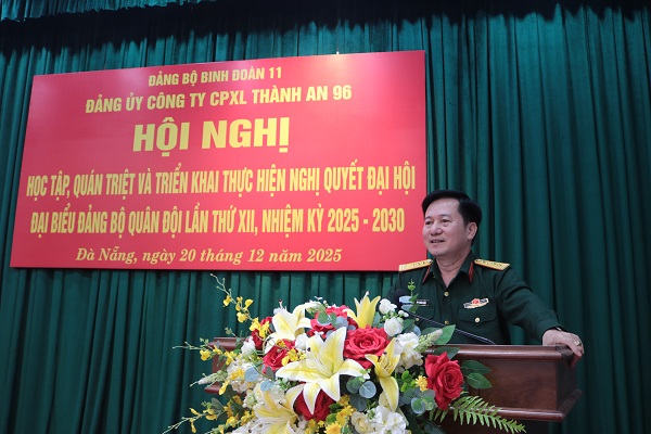 Ngày 20-12, Đảng ủy Công ty CPXL Thành An 96 đã tổ chức Hội nghị học tập, quán triệt, triển khai thực hiện Nghị quyết Đại hội đại biểu Đảng bộ Quân đội lần thứ XII, nhiệm kỳ 2025-2030. Đại tá Phan Xuân Bằng, Bí thư Đảng ủy, Chủ tịch HĐQT Công ty chủ trì hội nghị. Dự hội nghị có các đồng chí Đảng ủy viên, Ban Giám đốc Công ty, các đ/c Bí thư, Phó Bí thư đảng bộ bộ phận, chi bộ trực thuộc và toàn bộ đảng viên, quần chúng khối cơ quan Công ty.