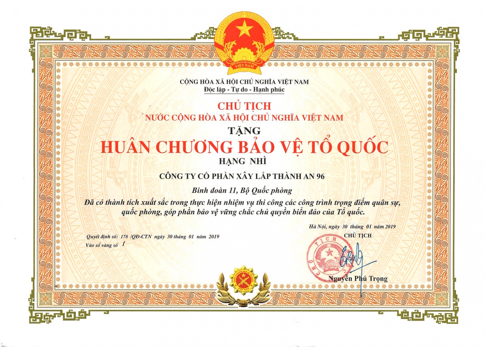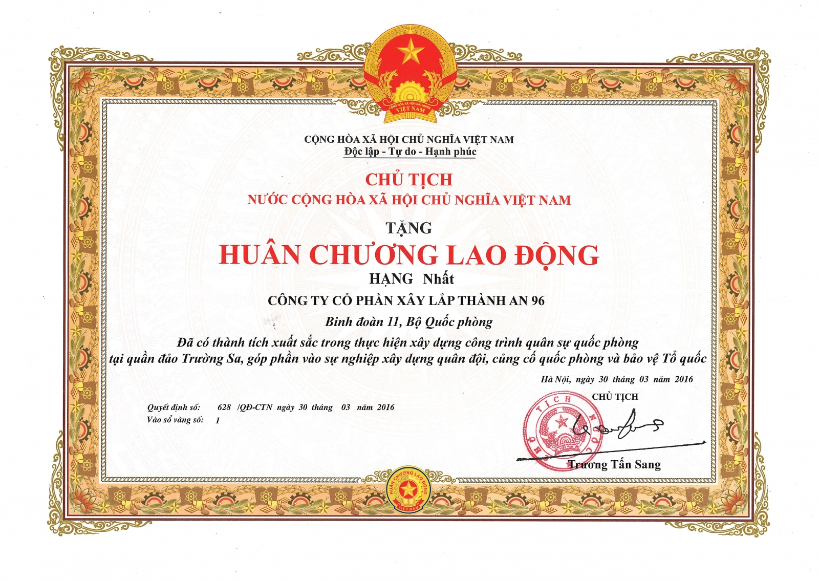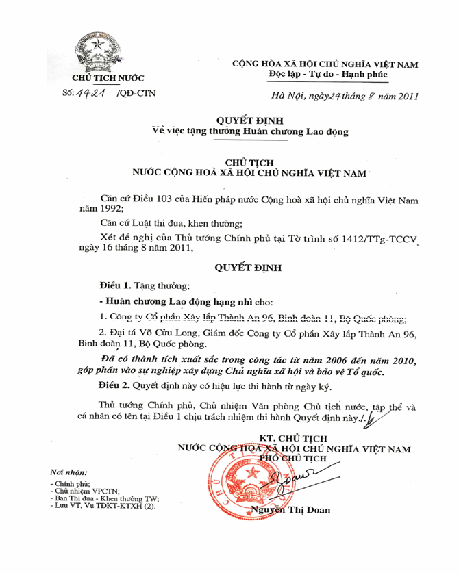Chủ tịch nước kí quyết định số 1421/QĐ-CTN tặng thưởng Huân chương Lao động hạng nhì cho công ty CPXL Thành An 96 |