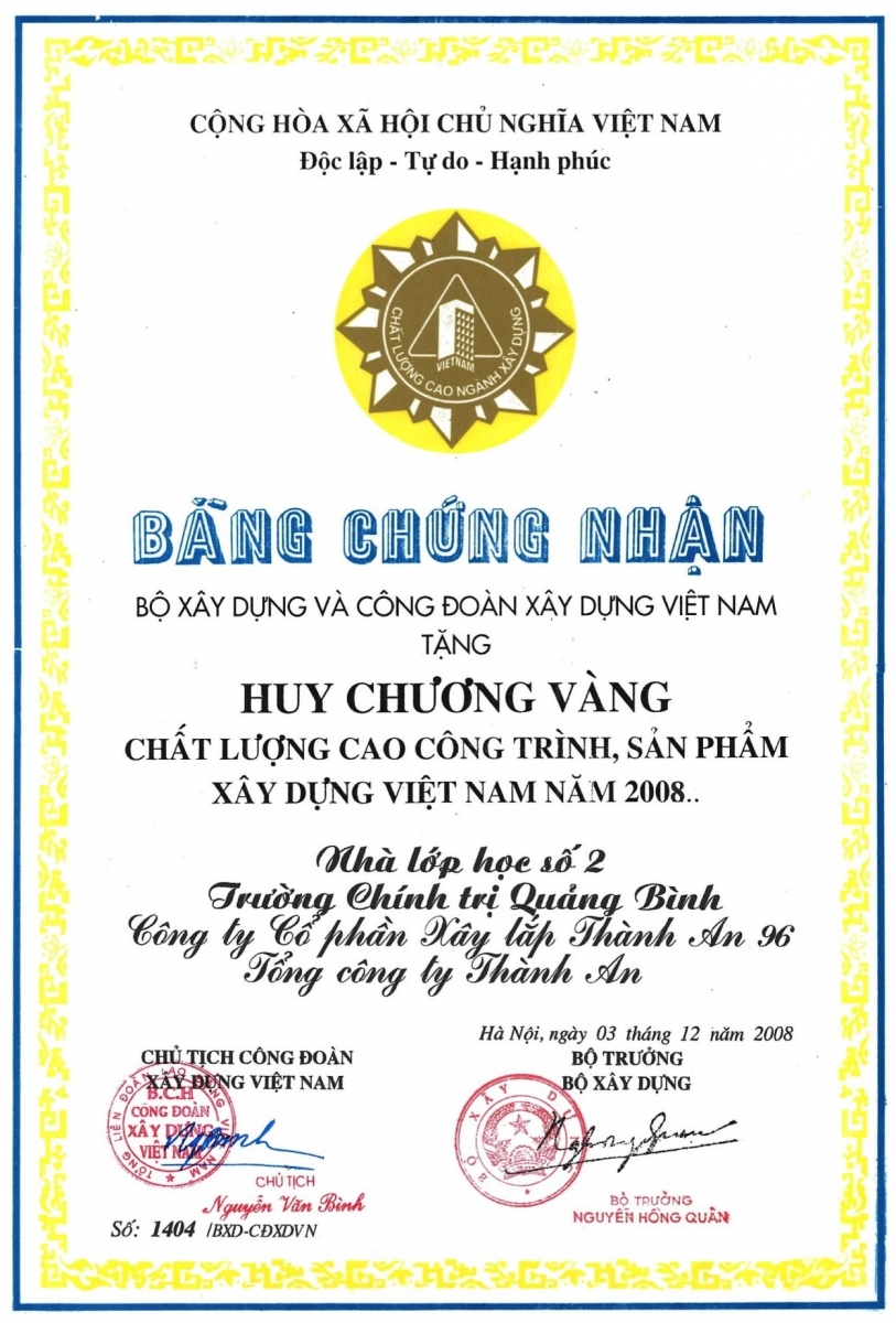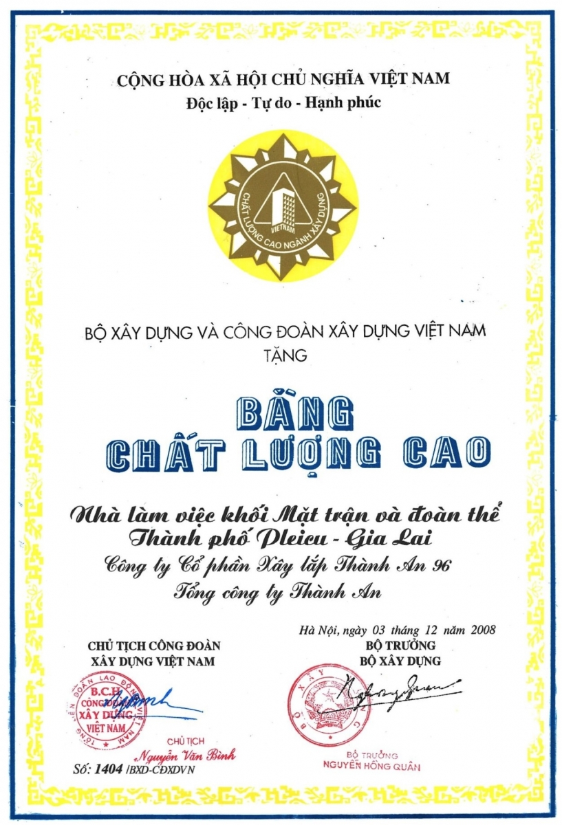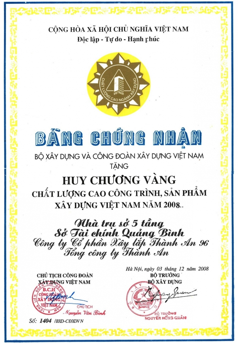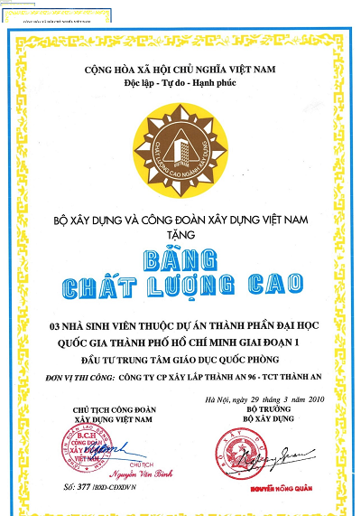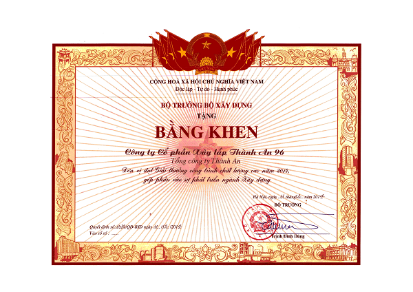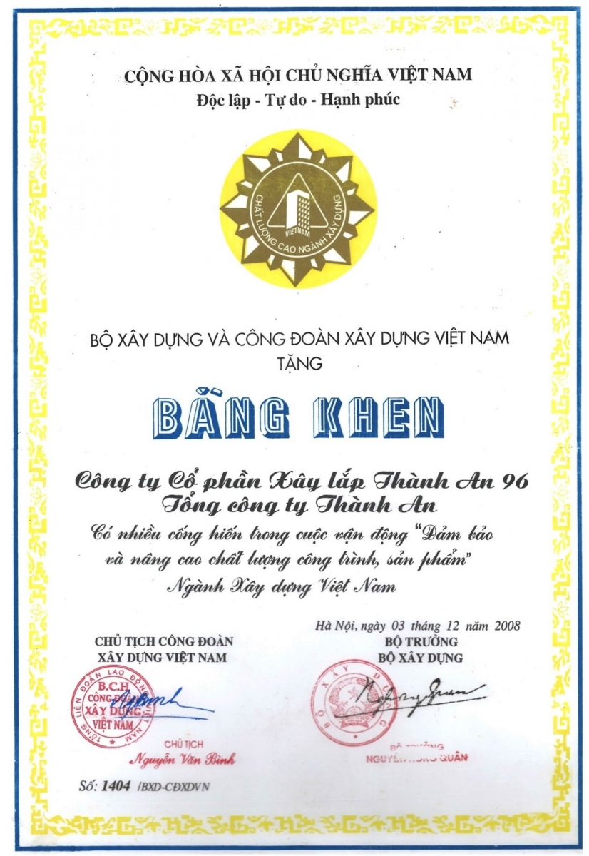 Bộ Xây dựng và Công đoàn Xây dựng Việt Nam tặng bằng khen công ty CPXL Thành An 96 có nhiều cống hiến trong cuộc vận động và nâng cao chất lượng công trình, sản phẩm Ngành Xây dựng Việt Nam |