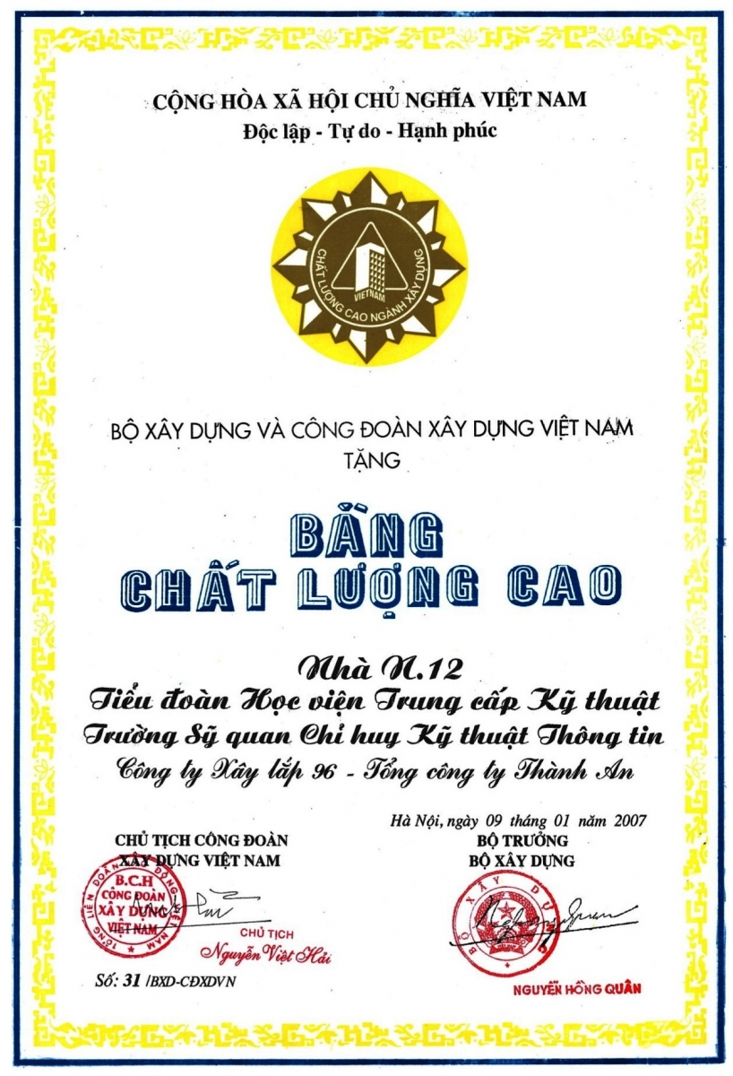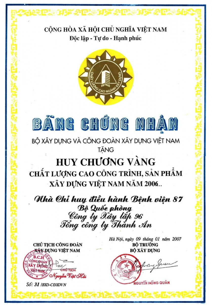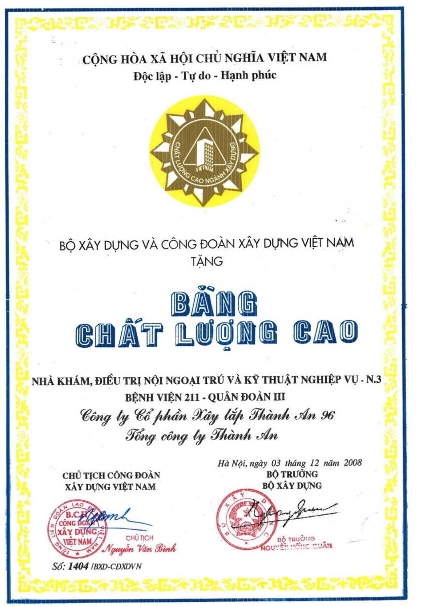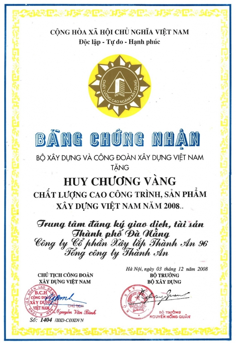 Bộ Xây dựng và Công đoàn Xây dựng Việt Nam tặng bằng khen công ty CPXL Thành An 96 có nhiều cống hiến trong cuộc vận động và nâng cao chất lượng công trình, sản phẩm Ngành Xây dựng Việt Nam |
