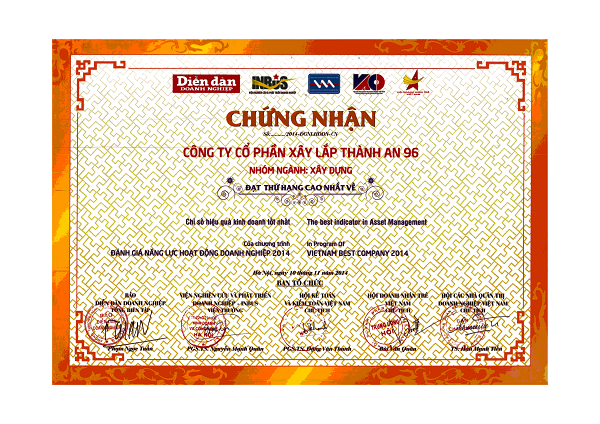 Chứng nhận công ty CPXL Thành An 96 đạt thứ hạng cao nhất về chỉ số hiệu quả kinh doanh tốt nhất của chương trình đánh giá năng lực hoạt động doanh nghiệp 2014 của báo diễn đàn doanh nghiệp, viện nghiên cứu và phát triển doanh nghiệp, hội kế toán và kiểm toán Việt Nam, hội doanh nhân trẻ Việt Nam, hội các nhà quản trị doanh nghiệp Việt Nam. |