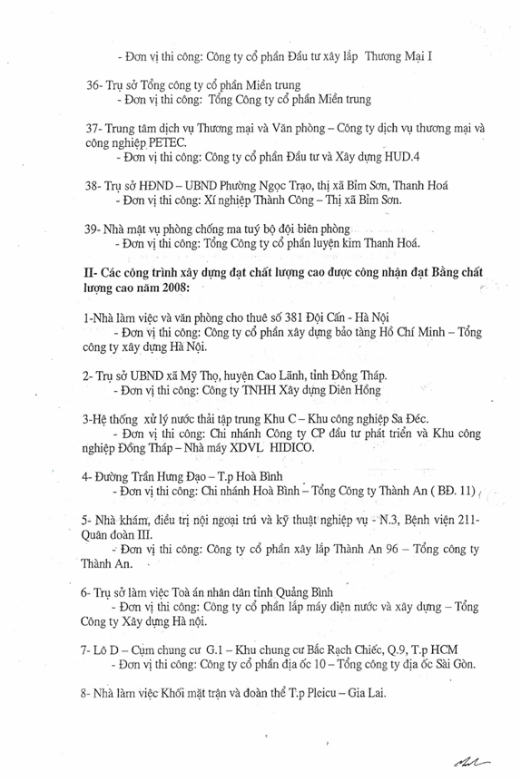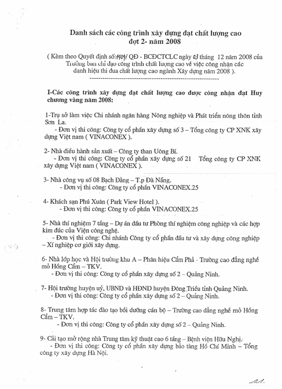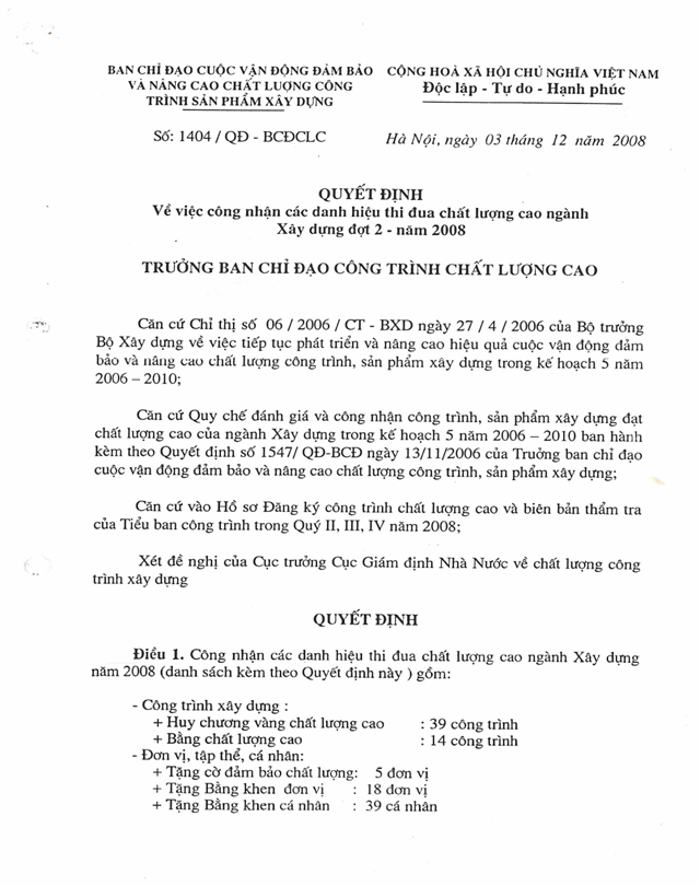 Quyết định số 1404/QĐ - BCĐCLC của ban chỉ đạo cuộc vận động đảm bảo và nâng cao chất lượng công trình, sản phẩm xây dựng tặng cờ Đảm bảo chất lượng năm 2008 cho công ty CPXL Thành An 96 |