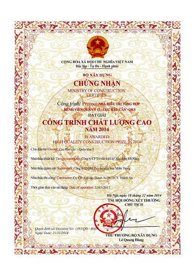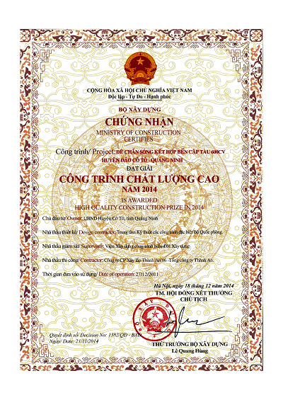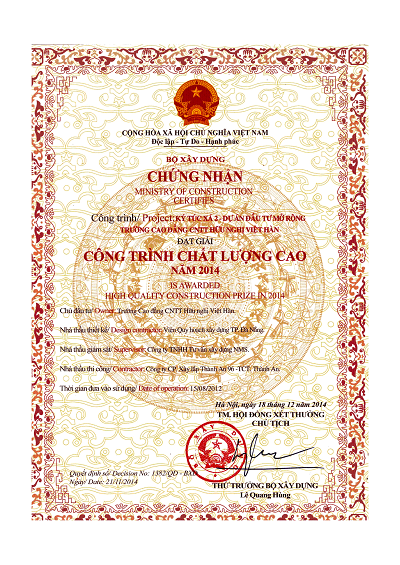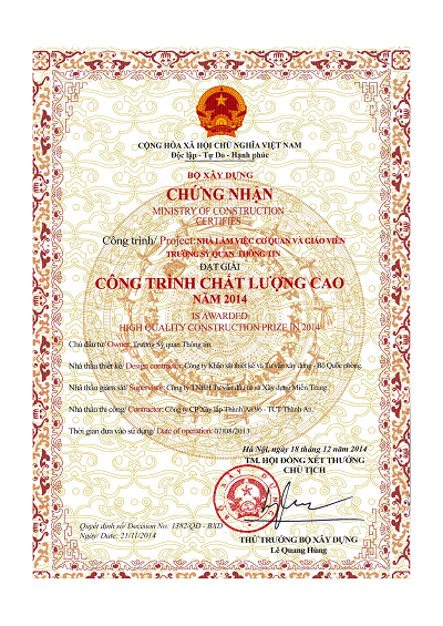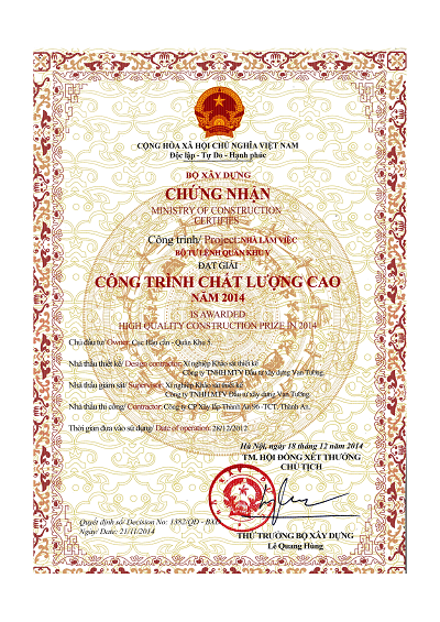 | 2014 | Bằng khen | Đơn vị được giải thưởng công trình chất lượng cao năm 2014, góp phần vào sự nghiệp phát triển ngành xây dựng | Bộ xây dựng |
