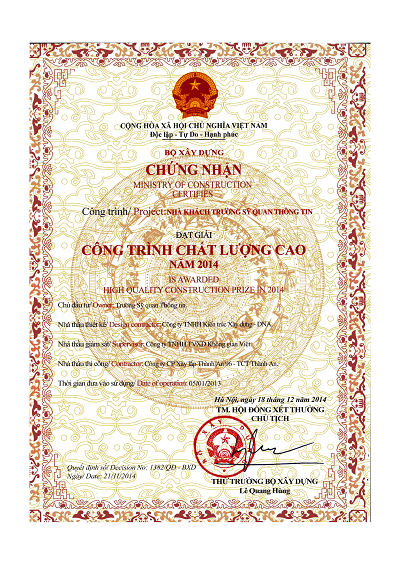 Bộ trưởng Bộ Xây dựng tặng bằng khen đơn vị giải thưởng công trình chất lượng cao năm 2014 góp phần vào sự nghiệp phát triển xây dựng |