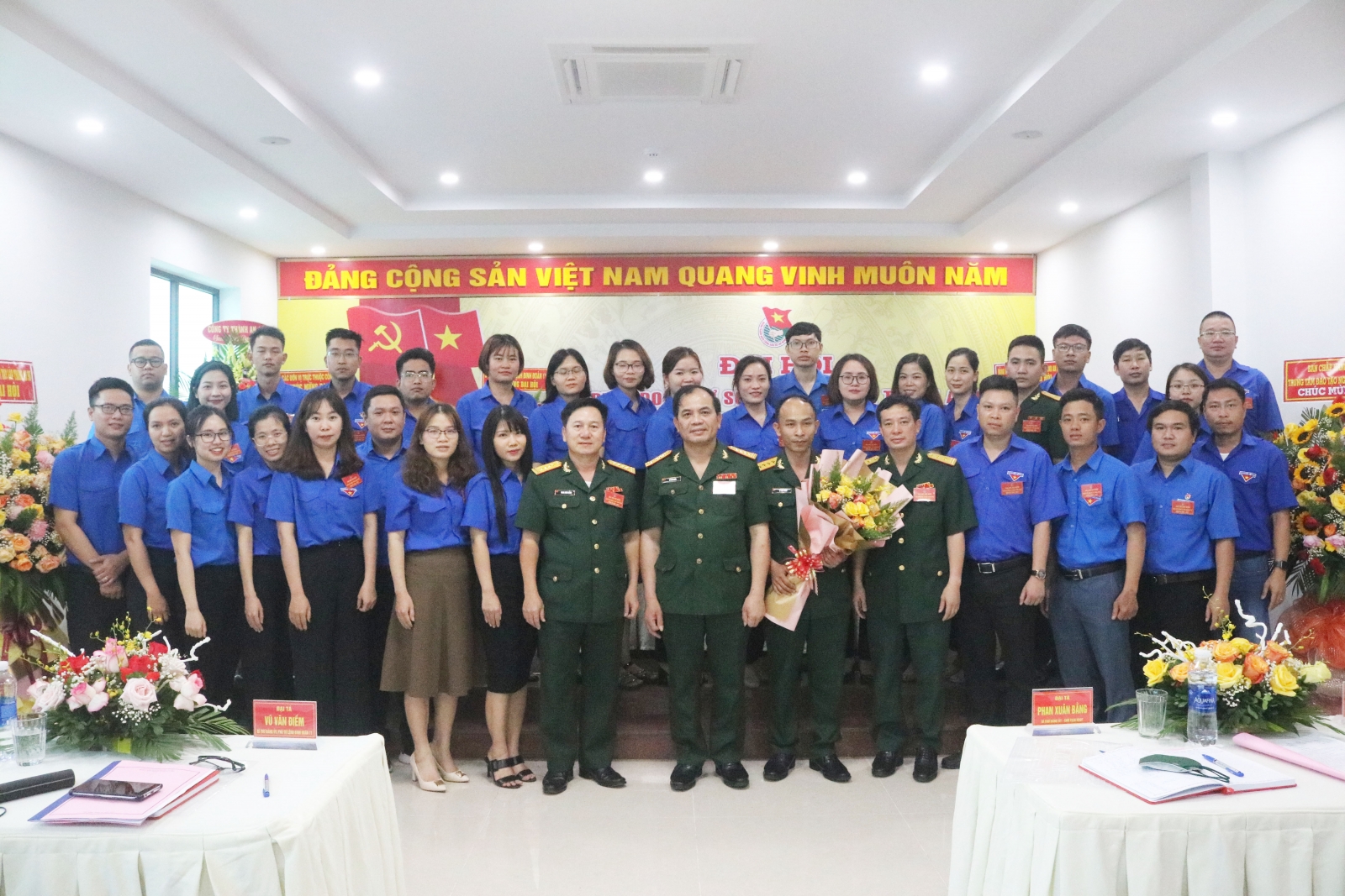 Đại tá Vũ Văn Điềm - Bí thư Đảng uỷ, Phó Tư lệnh Binh đoàn 11 tặng hoa chúc mừng BCH Đoàn cơ sở Công ty