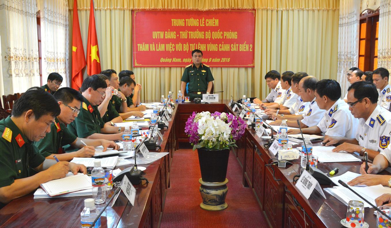 Kết luận buổi làm việc, Trung tướng Lê Chiêm ghi nhận và biểu dương những kết quả BTL Vùng CSB 2 đã đạt được trong thời gian qua. Trong đó, nổi bật là: BTL Vùng CSB 2 đã hoàn thành tốt nhiệm vụ bảo vệ chủ quyền biển, đảo; tuần tra, kiểm tra, kiểm soát, thực thi pháp luật trên biển; công tác cứu hộ, cứu nạn trên biển; nội bộ đoàn kết, thống nhất…