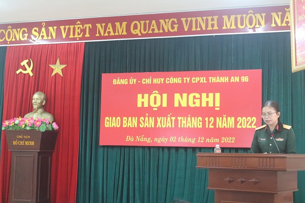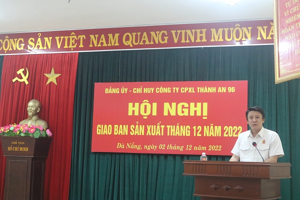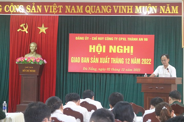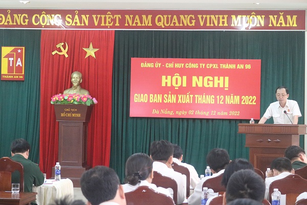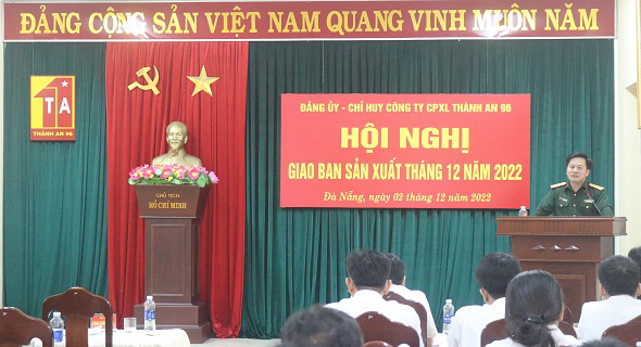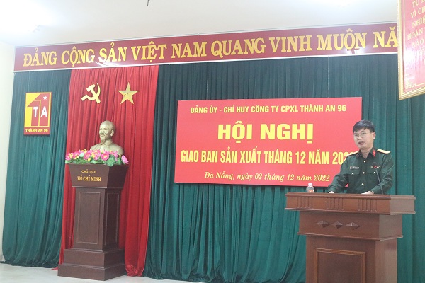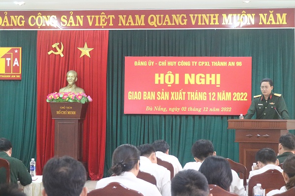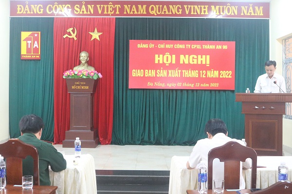 Theo chương trình kế hoạch, chiều ngày 02/12/2022, tại trụ sở, Công ty CPXL Thành An 96 tổ chức hội nghị giao ban sản xuất tháng 12, thành phần hội nghị có các đồng chí lãnh đạo, Chỉ huy Công ty; Chỉ huy các cơ quan, đơn vị và trưởng phụ trách các bộ phận chuyên môn.